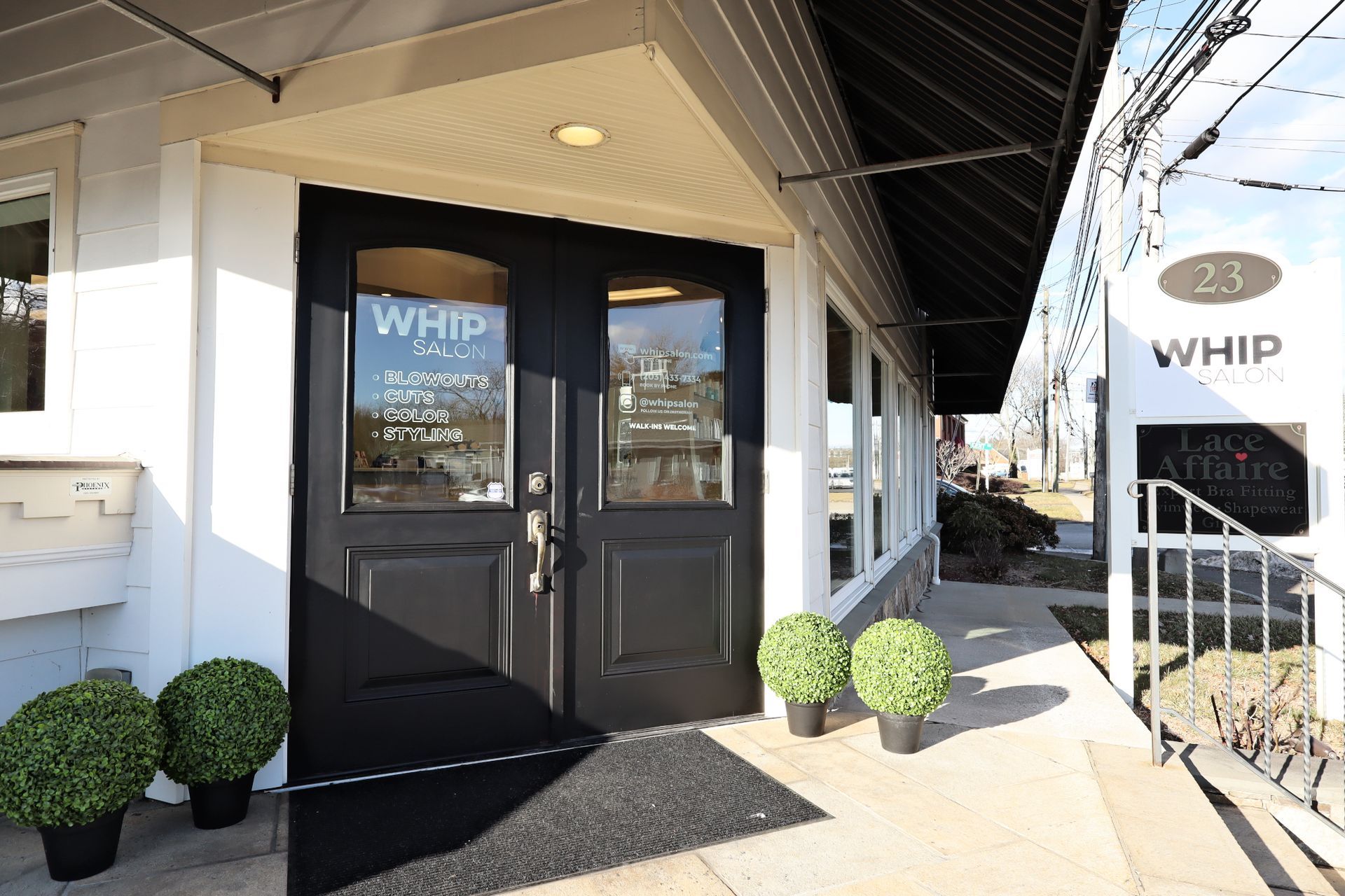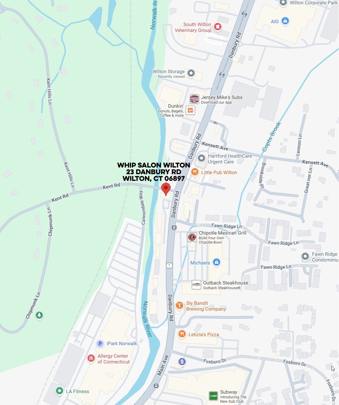Whip Salon Wilton is located near Little Pub, across the street, at the intersection of Route 7 and Kent Road. There is a large parking lot next to the building with free, unrestricted parking.